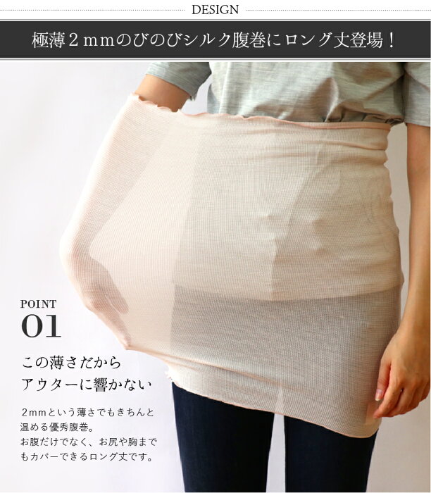 商品名 極薄2mm のびのびシルク腹巻 ロング 商品コード SO 5091 サイズ レディースFREE(長さ:約50cm 幅:約25cm) カラー 01.墨 / 02.桜色 素材 シルク99% ポリウレタン1% 生産地 日本