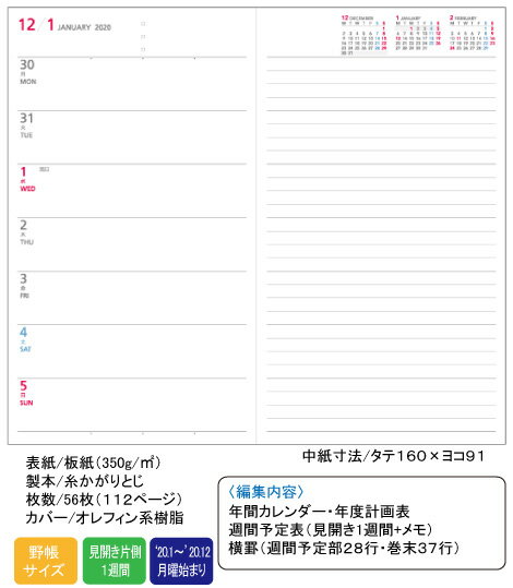ビジネスシーンにぴったり スリムなのにしっかりした表紙のカバー付きキャンパスダイアリー ●2019年の日付の入ったキャンパスダイアリー ●見開き1週間のウィークリータイプ 【製品仕様】 ●サイズ 野帳サイズ ●ノート寸法 160×91mm ●枚数 56枚(112ページ) ●紙質 上質紙 ●製本様式 糸かがりとじ ●編集内容 年間カレンダー:1ページ 年度計画表:2ページ 週間予定表(見開き1週間) 2019年1月〜2019年12月まで掲載 横罫(週間予定部分28行:1週間ごとに1ページ+巻末37行3ページ キャンパスダイアリーのその他のラインアップはこちら キャンパスダイアリー・ラインアップ一覧 ※メーカー生産が終了しているため弊社在庫限りとなります。